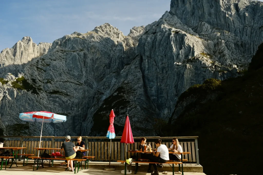 Net zoals bij veel bergwandelingen wordt ook hier naar verloop van tijd het uitzicht steeds mooier. Wandelend langs de ruige flanken van de Wilder Kaiser krijg je richting het oosten langzaam uitzicht over de Loferer Steinberge. Wie goed kijkt, kan zelfs de Watzmann in de Berchtesgadener Alpen zien liggen. Voordat je er erg in hebt ben je inmiddels zo’n 500 meter gestegen en kom je aan op het grote terras van het Stripsenjochhaus, waar je bij lekker weer kunt neerzakken.
